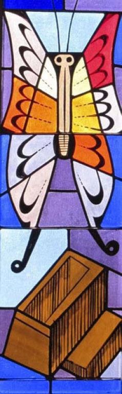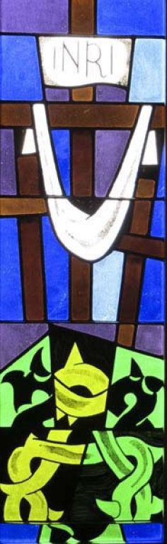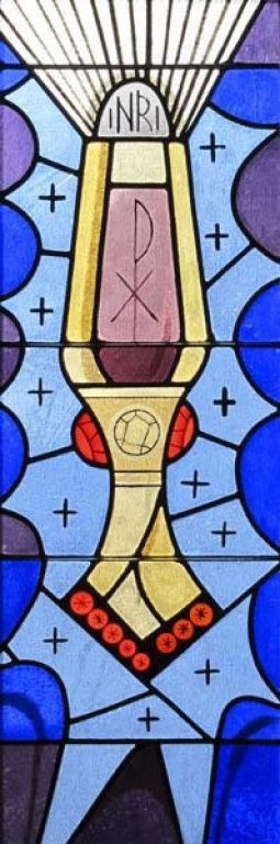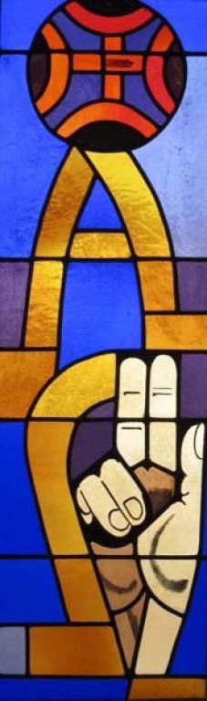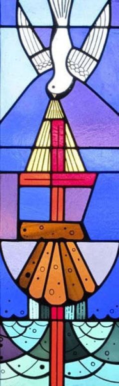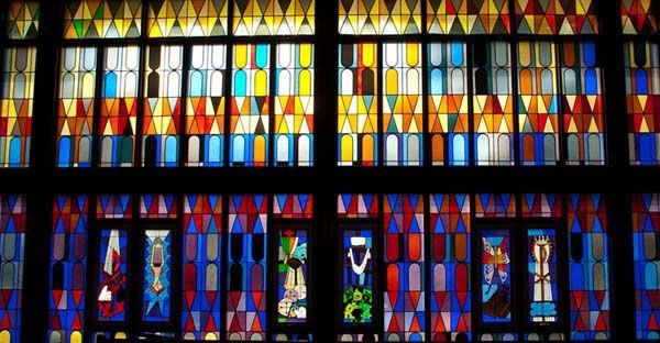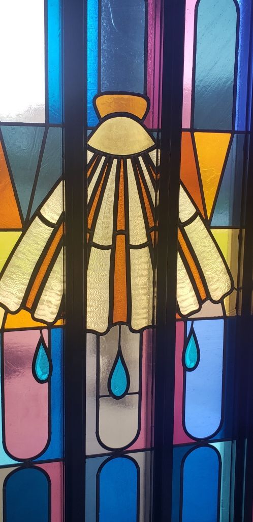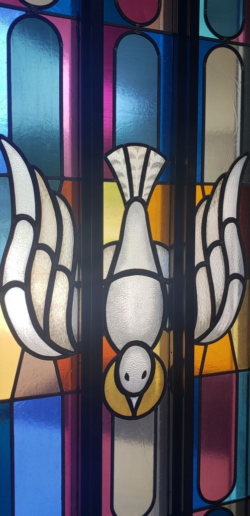 Stained glass windows from floor to ceiling adorn the entryway of the church. The first images you will see are the shell representing Baptism and the dove representing the Holy Spirit. These are flanked on either side by the front doors into the church. As you enter the church, you see the altar before you. On either side of the altar, the church building has wings, or transepts. The back wall of each transept is entirely stained glass, again from floor to ceiling. Each transept has six scenes that depict events from Jesus' life.